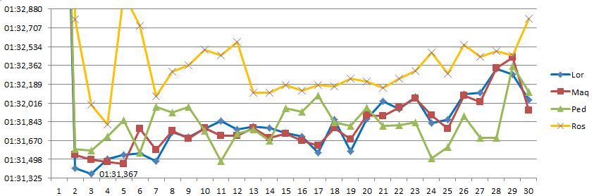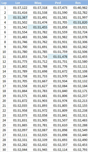 Sebelum menuju yang detail, mari simak grafik dan tabel laptime dari keempat rider berikut