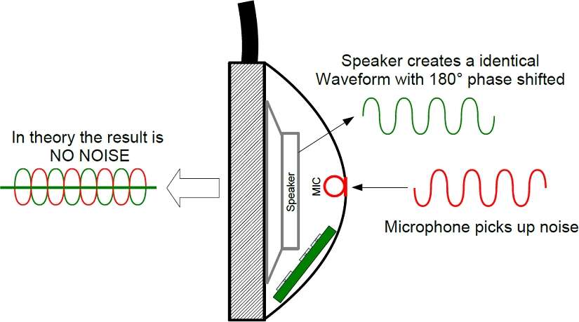 Headphone dengan teknologi noise cancellation memiliki microphone yang dapat menangkap ambient sound, misalnya suara mesin pesawat, kemudian menganalisa bentuk gelombangnya. Lalu headphone memproduksi suara dengan bentuk gelombang sama persis namun berkebalikan ke telinga penggunanya, sehingga suara pesawat tidak terdengar lagi.